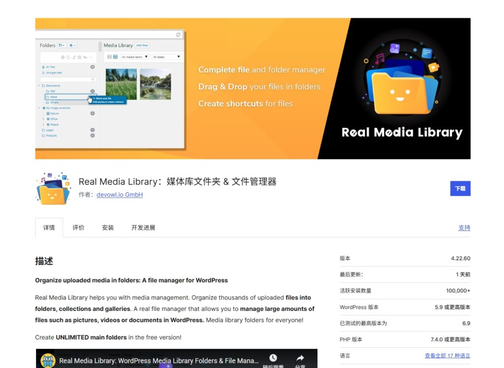推荐一个插件,之前我也提到过,叫Real Media Library,长这样: